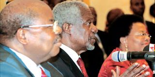Benjamin Mkapa (left), Kofi Annan (centre) and Graca Machel in mediation talks. Mr Mkapa lamented that African politicians are not sufficiently involved in negotiations. File