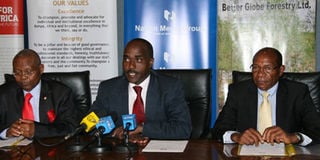Nation Media Group CEO Linus Gitahi (centre), KIM Board of Fellows chairman Peter Muthoka (left) and KIM Governing Council chairman Alfred Lenana during the launch of the Company of the Year Awards at Nation Centre on Tuesday. Photo/Jennifer Muiruri