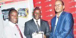 Francis Saya (centre) receives a donation of an engine from Bashir Mursal and Raphael Atanda of Car & General. PHOTO | FILE