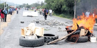 Karuturi flower farm workers block the road to demand payment of four months outstanding wages. FILE