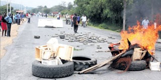 Karuturi flower farm workers barricade a road in protest to demand payment arrears. The firm was last month put on receivership for failing to pay a Sh383 million loan owed to CfC Stanbic Bank. FILE