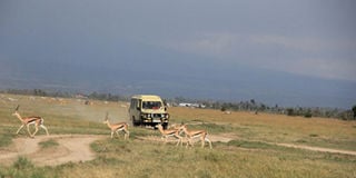 A herd of Thompson gazelles cross a road in front of a tour van. Narok County has turned to tour operators to sell entry tickets to Masai Mara Reserve. Photo/File