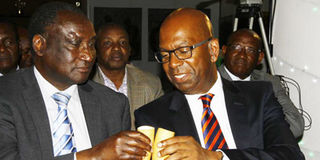 Athletics Kenya President Isaiah Kiplagat (left) and Safaricom CEO Bob Collymore toast during the launch of the third round of the Safaricom Athletics Series in Nairobi on April 2, 2015. PHOTO | MARTIN MUKANGU