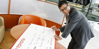 Toyota Kenya managing director Naoki Takeuchi signs a dummy cheque for Sh2.5 million at a past event in January 2013. He has been recalled and will be redeployed. FILE