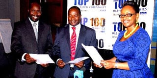 Kenya Top 100 project manager Robert Onyango (left), UAP Life Assurance Ltd MD Jerim Otieno and Nation Media Group marketing director Ann Gitao- Kinyua during the announcement of UAP’s sponsorship of the Kenya Top 100 survey at Nation Centre, Nairobi on Wednesday. SALATON NJAU