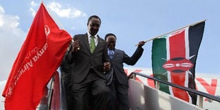 KQ CEO Titus Naikuni (left) and chairman Evanson Mwangi disembark from a Boeing 777-300ER at the Jomo Kenyatta International Airport, Nairobi. FILE