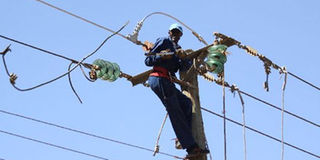 A Kenya Power worker inspects a transmission line. A drop in the cost of electricity and communication has pushed down inflation to 7.15 per cent in December. FILE