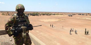 A KDF soldier attached to Amisom guards the Kismayu International Airport control tower. PHOTO | FILE