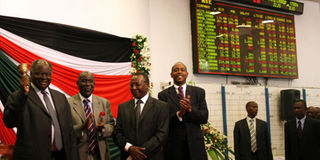 In this file picture, President Kibaki rings a bell during the launch of the Sh7 billion Housing Finance bond trading at the bourse. Housing Finance has attracted nearly double the amount of cash it has sought through the Sh2.9 billion second tranche bond. File