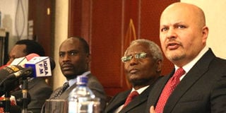 Former Head of Civil Service Francis Muthaura (centre) with his legal team headed by Karim Khan (right) at a news conference at the Serena Hotel on Wednesday. Photo/Phoebe Okall