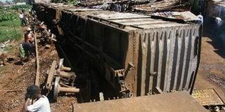 Kenya Railways workers at the site of a train that derailed in Kibera, Nairobi. The corporation will relocate some families living in Kibera and Mukuru kwa Njenga to prevent flooding of the railway line during the rainy season. Photo/File