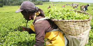 Workers pluck tea at a tea estate. Supply of tea to KTDA’s 66 factories rose 25 per cent, cushioning farmers from a drop in earnings that would have come from a dip in international tea prices. FILE