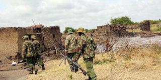 Security personnel patrol Kau Village in Tana River following an arson attack last month. About 300 raiders attacked Kilelengwani Village in Garsen yesterday killing 32 people, including nine police officers. Photo/File