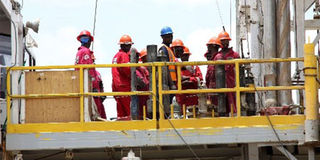 Workers at the Ngamia 1 oil rig in Turkana County. The East African Community has rejected push by local firms for special treatment in the regional oil pipeline deal. FILE