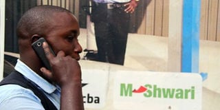 A man uses his mobile phone next to an M-Shwari poster. M-Shwari is a leading mobile banking service rolled out by Safaricom and the Commercial Bank of Africa. PHOTO | DIANA NGILA