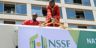 Workers erecting a new signboard on the National Social Security Fund. A new pension Bill proposes a substantial increase in the workers’ monthly contributions to the fund. FILE