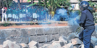 A police officer lobs a tear gas canister at protesting pupils of Lang'ata Road Primary School on January 20, 2015. President Kenyatta condemned the incident and said the NLC and the Lands ministry must be held accountable for not resolving the issue in good time. AFP PHOTO | TONY KARUMBA