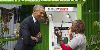US President Barack Obama when he visited the M-Kopa stand at the Power Africa Innovation Fair in July 2015 on the sidelines of the Global Entrepreneurship Summit in Nairobi. PHOTO | AFP