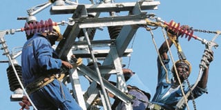 KPLC workers repair a power line at Rabai station in Kaloleni. Most of Kenya’s energy come from hydro and geothermal sources. Photo/FILE