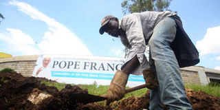 A labourer works at University of Nairobi grounds on Monday as final touches were done to welcome Pope Francis. PHOTO | EVANS HABIL