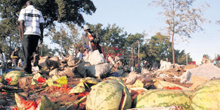 A man walks past a heap of fruits left behind after a grader flattened stalls at Oile market in Kisumu last week.Traders lost goods worth millions of shillings. PHOTO | JACOB OWITI | NATION MEDIA GROUP