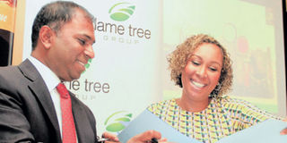 Flame Tree Group managing director Heril Bangera (left) with Suzie Beauty founder Suzie Wokabi during the signing of the acquisition deal. PHOTO | DIANA NGILA