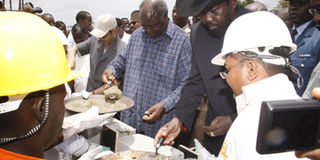 President Kibaki (centre), the late Ethiopian Prime Minister Meles Zenawi (left) and South Sudan President Salva Kiir Mayardit (right) lay foundation stones for the new Lamu Port as part of the LAPSSET Corridor project in Lamu County on March 2, 2012. Kiir has said the restarting of oil production crucial to the fledgling nation's economy is stalled after rival Sudan made further demands.