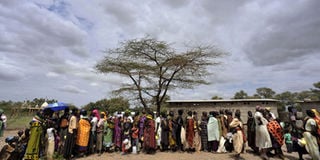 A file picture taken on August 8, 2011 shows Turkana women and children waiting for supplimentary feeding for infants at a relief and health centre in Kakuma, Turkana District, northwestern Kenya. AFP PHOTO / SIMON MAINA