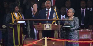 Kenya’s 4th President Uhuru Kenyatta is sworn into office on April 9, 2013 in Nairobi by Chief Registrar Gladys Sholei (left) as his wife Margaret (right) looks on. Mr Kenyatta was sworn into office amid cheers and applause from tens of thousands of supporters. Photo/TONY KARUMBA