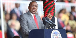 President Uhuru Kenyatta speaks during Monday’s Madaraka Day celebrations at Nyayo National Stadium. PHOTO | BILLY MUTAI