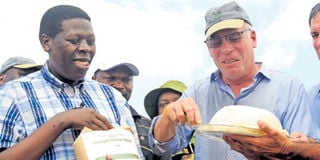 Irrigation secretary Eugene Wamalwa with Israeli Agriculture minister Uri Ariel during the launch of maize harvesting at the Galana Kulalu irrigation scheme last September. PHOTO | FILE