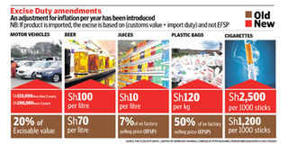 Cigarettes will be charged Sh2,500 per 1,000 sticks, up from Sh1,200, or a stick is up Sh1.30. Beer attracts a flat tax of Sh100 per litre, up from Sh70.