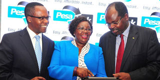 KBA chief executive Habil Olaka (right), Integrated Payment Services boss Jennifer Theuri and KBA vice-chairman John Gachora at the launch of PesaLink. PHOTO | FILE