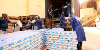 Workers load cartons of counterfeit milk in a truck in Kisumu in January. FILE PHOTO | NMG