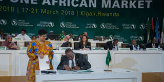 President Uhuru Kenyatta signs trade agreements during the 10th Extraordinary Session of the African Union Heads of State and Government Summit in Kigali in March 2018. FILE PHOTO | NMG