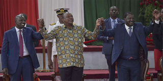 President Uhuru Kenyatta, Deputy President William Ruto and former Prime Minister Raila Odinga during the launch of the BBI report at Bomas. FILE PHOTO | NMG