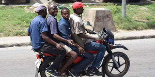 A motorcyclist carries excess passengers in Mombasa. FILE PHOTO | WACHIRA MWANGI