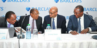 From left: Barclays Bank of Kenya Company Secretary Paul Ndungi, chairman Charles Muchene, managing director Jeremy Awori and chief financial officer Yusuf Omari during a past AGM. PHOTO | NMG