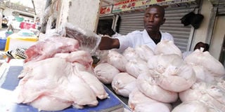 A trader weighs chicken at his stall at City Market waiting for customers. PHOTO | DIANA NGILA