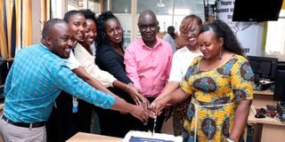 Some of Business Daily staff cut the cake at Nation Centre on Monday, March 14, 2022, to celebrate 15 years since the paper was launched. PHOTO | DENNIS ONSONGO | NMG