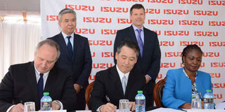 Mario A. Spangenberg, president and managing director of GM Africa and Middle East Operations, Shinsuke Minami, executive officer, Sales Division at Isuzu Motors Limited and Rita Kavashe, managing director, GM East Africa. PHOTO | DIANA NGILA