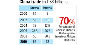 African exports to China almost doubled in the last decade, from five per cent in 2000 of total exports to 10 per cent in 2007.