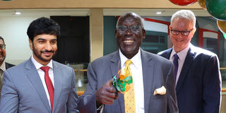 DIB Bank director Steve Mainda cuts the ribbon to officially launch the lender’s Sarit branch on July 10, 2023, assisted by UAE Charge D'affaires Khalifa AlRayssi. Looking on is DIB director Michael Murphy. PHOTO | COURTESY