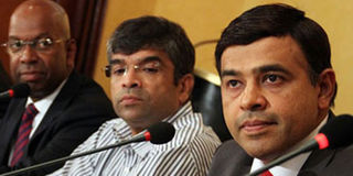 Safaricom CEO Bob Collymore, former Airtel Kenya managing director Shivan Bhargava and yuMobile chief executive Madhur Taneja during a past Press briefing in Nairobi. Photo/FILE