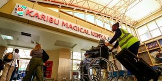 An attendant aids a physically challenged woman through the passengers' exit at the International Arrival Terminal 1A at Jomo Kenyatta International Airport on November 7, 2023.