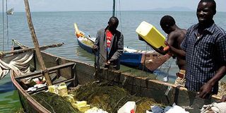 A fisherman at Ogal beach in kisumu shows a container they use as a floater in case of an emergency in the waters. Fishing in the country has further been worsened by the fact that there is an insufficient training system for experts to man Kenyan vessels on Lake Victoria and the Indian Ocean. PHOTO/ FILE