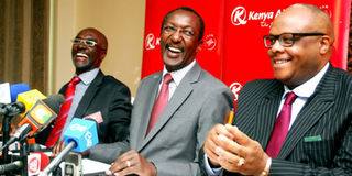 Kenya Airways chief operating officer Mbuvi Ngunze (left), the chief executive officer Titus Naikuni (centre), and finance director Alex Mbugua during an investor briefing for the release of the airlines half year results for the period ended September 2013 at the Intercontinental Hotel in Nairobi on November 13, 2013. SALATON NJAU