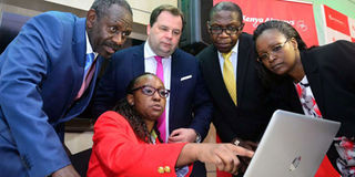 From left, NSE vice chair Bob Karina, Kenya Airways CEO Sebastian Mikoz, NSE chief executive Geoffrey Odundo and Kenya Airways acting finance director Hellen Mwariri are taken through the trading of KQ shares by a trader of Kestrel Capital (seated) on November 29, 2017. PHOTO | SALATON NJAU | NMG