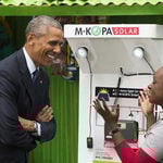 US President Barack Obama when he visited the M-Kopa stand at the Power Africa Innovation Fair in 2015 on the sidelines of the Global Entrepreneurship Summit in Nairobi. FILE PHOTO | NMG