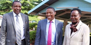 University of Embu chancellor Paul Musili Wambua (centre) with vice-chancellor Daniel Mugendi and council chairperson Margaret Gikuhi at the institution last November. PHOTO | CHARLES WANYORO | NMG